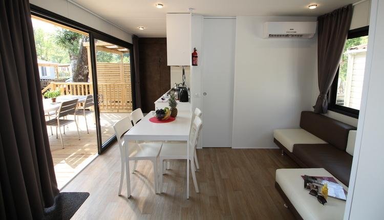 Das Mobilheim hat eine Klimaanlage und eine große Holzterrasse mit luxuriösem Lounge-Set und Überdachung für maximalen Komfort im Freien.