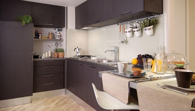 - Voll ausgestattete Küchenecke: 4-Flammen-Gasherd mit Dunstabzugshaube, Kaffeemaschine, Wasserkocher, Mikrowelle und Kühlschrank mit Gefrierfach