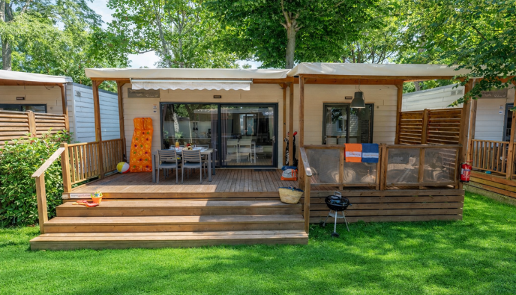 Das Mobilheim verfügt über eine Klimaanlage und eine große Holzterrasse mit luxuriösem Lounge-Set und Überdachung, so dass Sie immer im Freien genießen können.