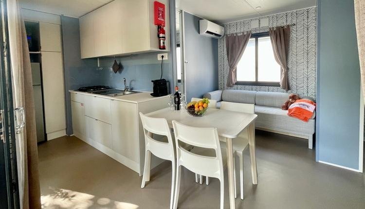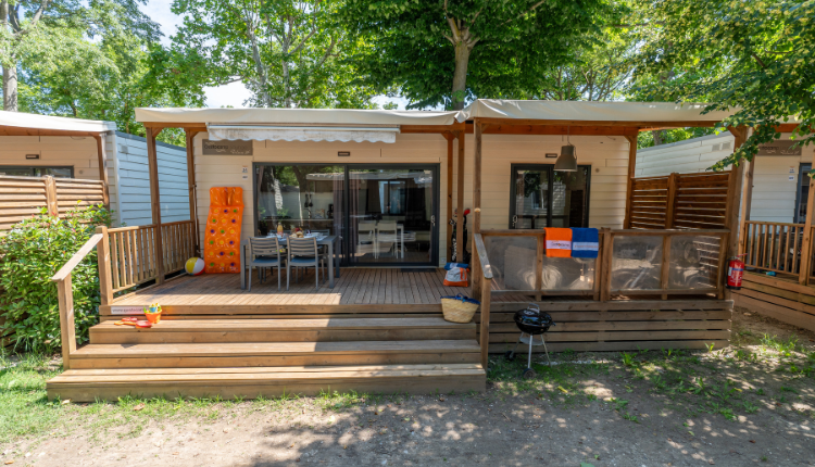 Das Mobilheim verfügt über eine Klimaanlage und eine große Holzterrasse mit luxuriösem Lounge-Set und Überdachung, so dass Sie immer im Freien genießen können.