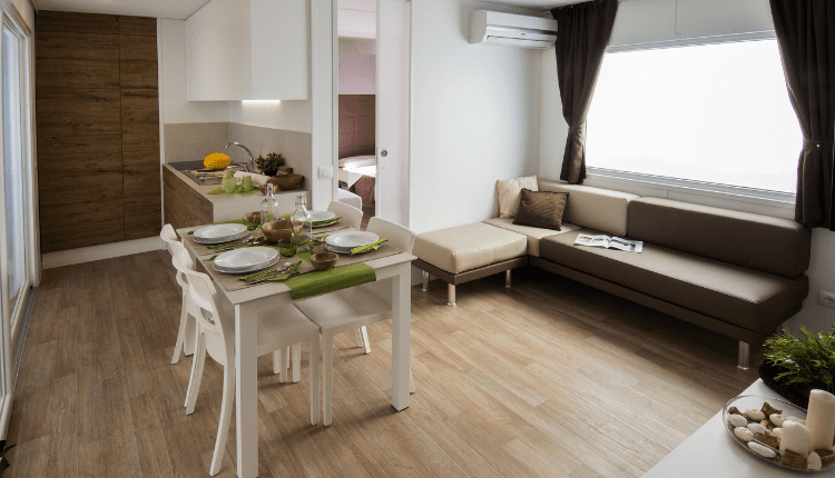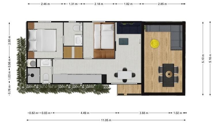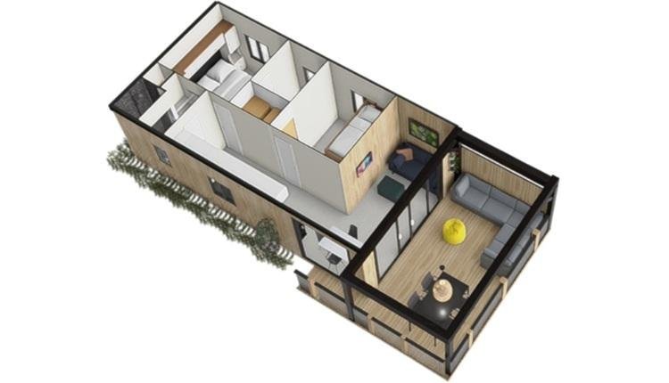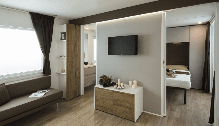 Das Mobilheim Gusto Fusion ist die ideale Wahl für Familien, die im Urlaub Wert auf Platz, Komfort und Luxus legen. Dieses neue Mobilheim bietet zwei geräumige Schlafzimmer, eine moderne offene Küche und ein großes, helles Wohnzimmer. Luxuriöse Schiebetüren führen direkt auf die große, teilweise überdachte Holzterrasse, wo Innen- und Außenbereich fließend ineinander übergehen. Ob mit kleinen Kindern oder Teenagern – im Gusto Fusion genießt die ganze Familie einen entspannten und unbeschwerten Urlaub.