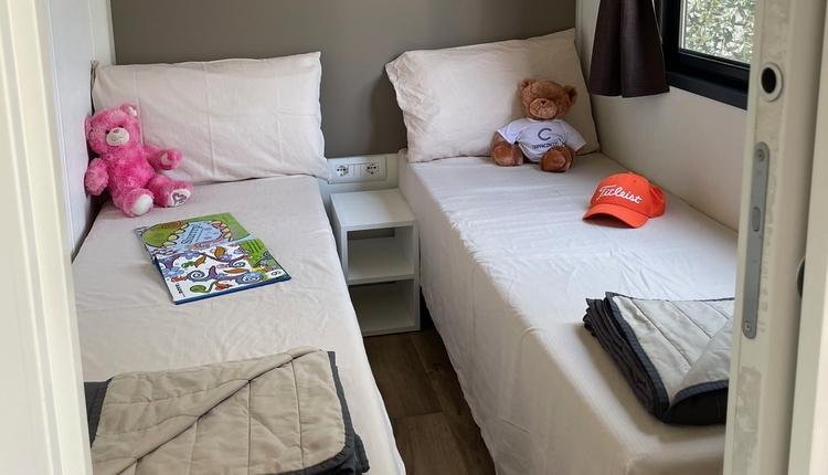 - 2 Schlafzimmer mit 2 Einzelbetten (1 Bett kann unter das andere für ein Kinderbett geschoben werden)
