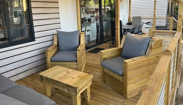 Außerdem verfügt das Mobilheim über eine komfortable, vollständig überdachte Holzterrasse mit Lounge-Set, so dass Sie bei jedem Wetter den Aufenthalt im Freien genießen können. Die Klimaanlage sorgt für zusätzlichen Komfort und kann in der Vor- und Nachsaison auch als Heizung dienen.