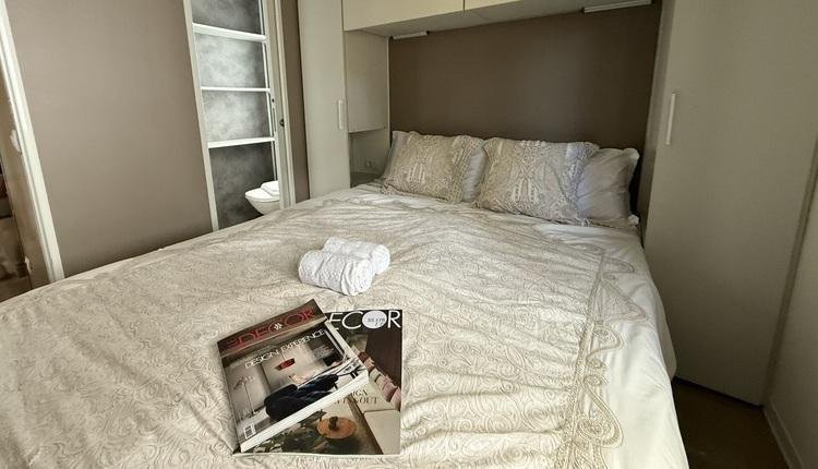 Das geräumige Mobilheim Gran Lounge Deluxe ist dank des zusätzlichen 3. Schlafzimmers ideal für größere Familien oder gemeinsam reisende Paare. Das Mobilheim verfügt über ein geräumiges Wohnzimmer und eine offene Küche. Die moderne Küche ist komplett ausgestattet und verfügt über einen 4-Flammen-Gasherd, eine Mikrowelle, eine Kühl-Gefrierkombination und eine Kaffeemaschine.
