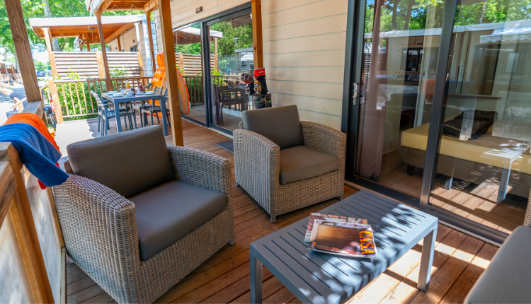 Das Mobilheim hat eine Klimaanlage und eine große Holzterrasse mit luxuriösem Lounge-Set und Überdachung für maximalen Komfort im Freien.