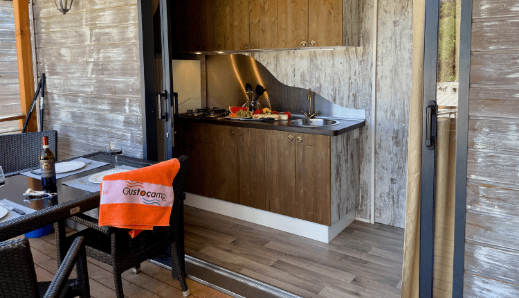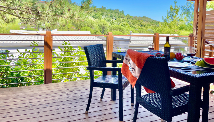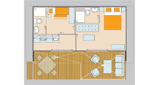 Mit Stolz präsentieren wir unser Mobilheim Savanna Lodge Deluxe. Das Mobilheim kombiniert die Vorteile eines Mobilheims mit der räumlichen Freiheit eines Zelts. Dabei haben die Designer sich von den afrikanischen Lodgezelten inspirieren lassen. Die Savanna Lodge verfügt über zwei Schlafzimmer mit jeweils einem eigenen Badezimmer inklusive Dusche, Waschbecken und Toilette. Mit zwei Schiebewänden können Sie den Küchenbereich von den Schlafzimmern trennen, oder einen großen Wohnbereich kreieren. Sie entscheiden! Zwei große Schiebetüren führen auf die halb überdachte Holzterrasse mit Gartenmobiliar und einem Grill. Selbstverständlich ist das Mobilheim ebenfalls mit einer Klimaanlage ausgestattet.