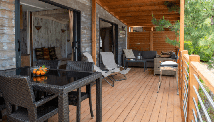 Halb überdachte Holzterrasse mit Gartenmöbeln und Grill.