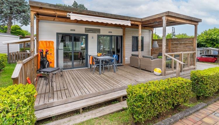 Das Mobilheim verfügt über eine teils überdachte Terrasse mit Lounge-Möbeln mit Kissen. Zudem gibt es einen Sitz- Essbereich, der mit Tisch und Stühlen ausgestattet ist. Ein (Gas-) Grill darf natürlich auch nicht fehlen.