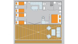 Das 3 Schlafzimmer Mobilheim ist eines der größten Modelle und verfügt über einen geräumigen und gemütlichen Wohnbereich mit einer Doppeltür zur Terrasse. Eines der Schlafzimmer verfügt über ein Doppelbett, das zweite und dritte Schlafzimmer verfügen über je zwei Einzelbetten. In unseren Mobilheimen sind auch Bettdecken und Kissen vorhanden, sodass Sie sich nur um die Bettbezüge kümmern müssen. Neben einem Badezimmer mit Dusche und Waschbecken, verfügt dieses Modell über eine separate Toilette. Eine gut ausgestattete Küche mit großem Kühlschrank mit Gefrierfach, Gasherd, Mikrowelle, sowie eine Klimaanlage/Heizung sorgen für einen bequemen Urlaub.